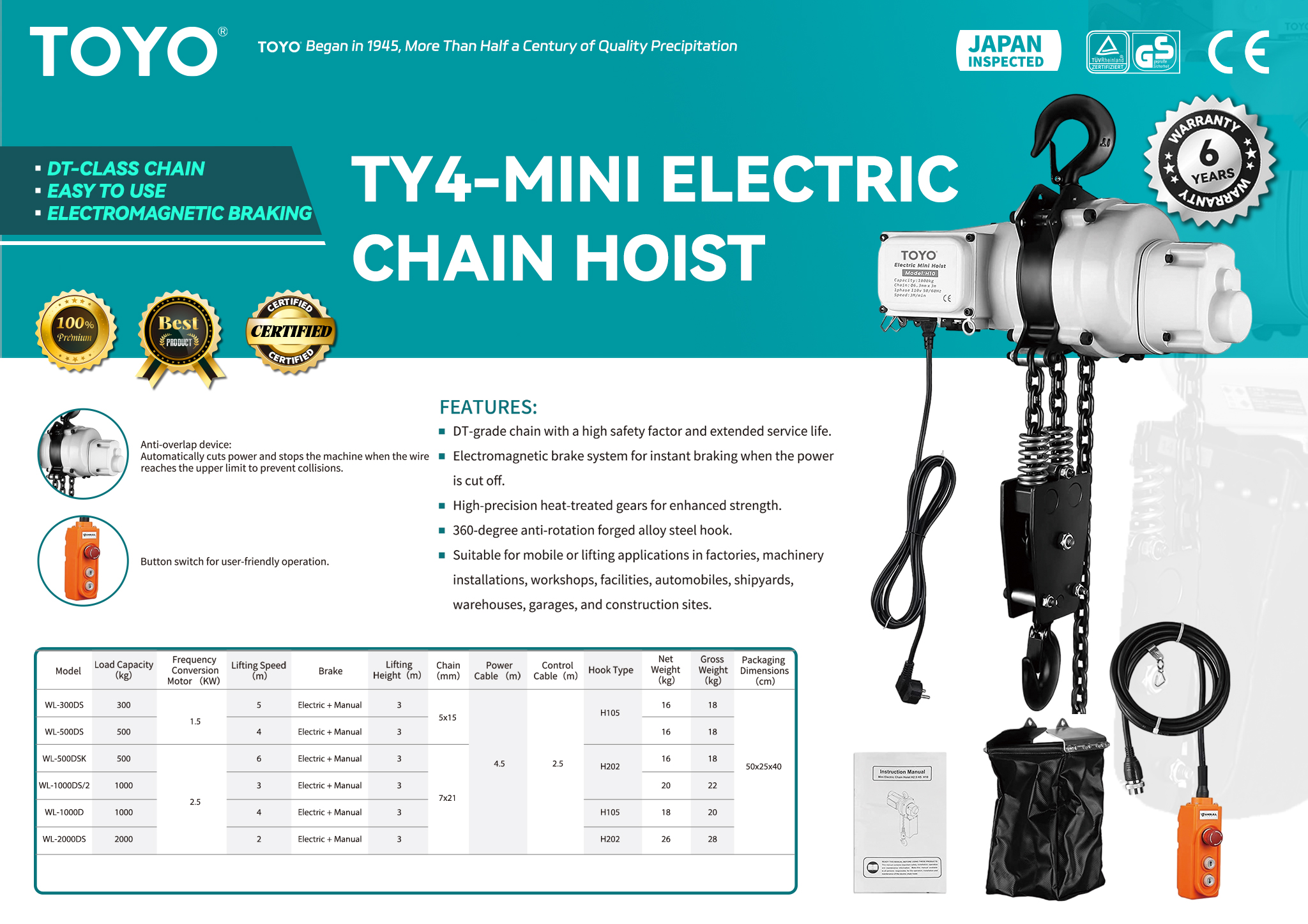 Composants principaux : Équipé d'une chaîne de qualité DT, d'un système de freinage électromagnétique, d'engrenages de haute précision traités thermiquement, d'un crochet en acier allié forgé anti-rotation à 360 degrés, d'un dispositif anti-chevauchement et d'un interrupteur à bouton.