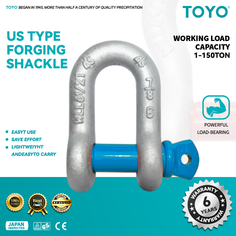 US Type forging shackle BASIC INTRODUCTION TOYO US Type forging shackle has G209 (rated load 1/3 – 85 tons) and G2130 (1/2 – 150 tons) models, it is a typical D shackle. It offers electro – galvanized or hot – dip galvanized surfaces, made by die – forging, hardened, annealed, with alloy steel pins, and working loads marked on each body. FEATURES Strong Structure: Die – forged and heat – treated, with alloy steel pins for high strength. Clear Marking: Working load markings help with model selection. Corrosion – Resistant: Galvanized surfaces suit harsh environments. Safe: Maximum guaranteed load is 2.2x working load, minimum breaking strength 4 – 6x. See our Rigging and Sling Catalog for more info! Product Details of D shackle Specs of D shackle US Type forging shackle G209 Specifications (in ): Capacity(t) Dimensions (inches) Net Weight(kg) A B C 1/4 1/2 0.47 0.31 0.97 0.05 5/16 3/4 0.53 0.38 1.07 0.08 3/8 1 0.66 0.44 1.28 0.13 7/16 1-1/2 0.75 0.5 1.48 0.2 1/2 2 0.81 0.63 1.66 0.27 5/8 3-1/4 1.06 0.75 2.04 0.57 3/4 4-3/4 1.25 0.88 2.4 1.19 7/8 6-1/2 1.44 1 2.86 1.43 1 8-1/2 1.69 1.13 3.24 2.15 1-1/8 9-1/2 1.81 1.25 3.61 3.06 1-1/4 12 2.03 1.38 3.97 4.11 1-3/8 13-1/2 2.25 1.5 4.43 5.28 1-1/2 17 2.38 1.63 4.84 7.23 1-3/4 25 2.88 2 5.78 12.13 2 35 3.25 2.25 6.77 19.19 2-1/2 55 4.13 2.75 8.07 32.27 3 85 5 3.25 8.56 42.5 US Type forging shackle G2130 Specifications (in ): Capacity(t) Dimensions (inches) Net Weight(kg) A B C 1/4 1/2 0.47 0.31 0.91 0.06 5/16 3/4 0.53 0.38 1.07 0.1 3/8 1 0.66 0.44 1.28 0.15 7/16 1-1/2 0.75 0.5 1.48 0.22 1/2 2 0.81 0.63 1.63 0.34 5/8 3-1/4 1.06 0.75 2 0.67 3/4 4-3/4 1.25 0.88 2.38 1.17 7/8 6-1/2 1.44 1 2.81 1.75 1 8-1/2 1.69 1.13 3.19 2.52 1-1/8 9-1/2 1.81 1.25 3.58 3.45 1-1/4 12 2.03 1.38 3.94 4.9 1-3/8 13-1/2 2.25 1.5 4.38 6.27 1-1/2 17 2.38 1.63 4.81 8.39 1-3/4 25 2.88 2 5.75 14.24 2 35 3.25 2.25 6.75 21.21 2-1/2 55 4.13 2.75 8 38.56 3 85 5 3.25 8.5 56.36 3-1/2 120 5.25 3.75 – 120 4 150 5.5 4.25 – 156 Application Used in construction (hoisting, scaffolding), marine (mooring, cargo handling), industrial manufacturing (equipment installation), and transportation (goods fixing) to connect and bear loads. Get a Free Quote Send Like this product? Share to your platform ➔ Related products Steel Wire Rope For Lifts Steel Wire Rope for Aerospace Control Stainless Steel Wire Rope Steel Wire Rope (Ungalvanized and Galvanized) SL Drum clamp Round sling Nylon Rope G80 CHAIN SLING